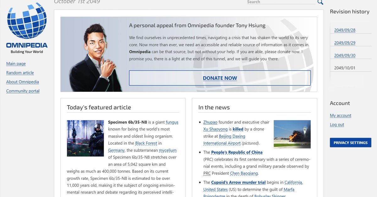 Omnipedia, according to its in-world description, is an “English-language online encyclopedia founded by internet entrepreneur Tony Hsiung in June 2049. Intended as “a general reference work and trusted source of information,” Hsiung initially conceived of Omnipedia as a successor to Wikipedia, which was discontinued in 2048.”